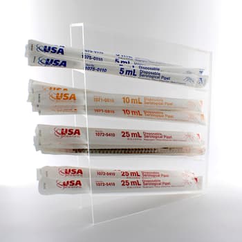 Protects and organizes glass and plastic pipettes. Angled four shelved compartments keep your 0.1 to 50 mL pipettes within easy reach while preventing damage and clutter. Heavy duty acrylic provides crystal-clear viewing from any angle.